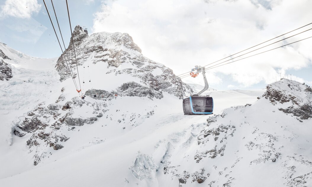 Pendant le trajet vers la station la plus élevée d’Europe, les cabines spéciales de cette remontée dévoilent une vue inédite: Après quelques minutes, le fond en verre obscurci semble s’ouvrir au-dessus de l’abîme et dévoilant à la seconde même une vue grandiose sur les paysages glaciaires. Cela, grâce à l’emploi d’un verre feuilleté actif qui, sous l’influence de l’électricité, passe de l’état blanc laiteux à la transparence.
