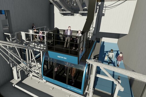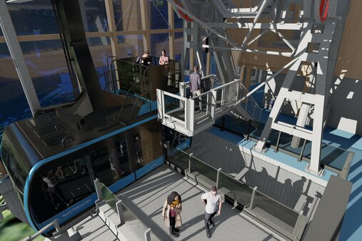 Pendant que le Matterhorn-Express continue de tourner activement, la nouvelle téléphérique de Zermatt à Furi est en construction à côté et commencera à fonctionner à l'automne 2023. Les cabines modernes peuvent accueillir jusqu'à 100 personnes et offrent une vue parfaite sur le Matterhorn grâce à leur design moderne avec de grandes fenêtres en verre. Lors du trajet au-dessus de l'extrémité du village de Zermatt, deux points forts spéciaux vous attendent. D'une part, le support numéro un juste après la station inférieure, qui sera construit sous la forme d'une loupe. Selon l'angle de vue, les cabines passeront à travers la structure de la loupe avec le Matterhorn en focus, créant ainsi une image fascinante. De plus, il sera possible de faire le trajet en Rooftop-Ride. Comme son nom l'indique, les passagers pourront profiter de la vue depuis le toit de la cabine avec une brise fraîche dans leur visage.